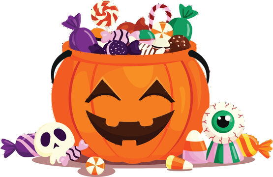 Happy Halloween pumpkin bucket overflowing with colorful candy treats and spooky decorations