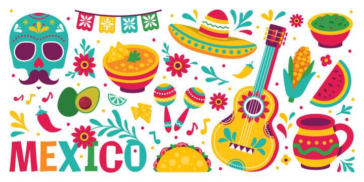 Mexican-themed vector illustration with fiesta elements including sugar skulls, sombrero, guitar, maracas, tacos, and chili. Perfect for Cinco de Mayo or Día de los Muertos