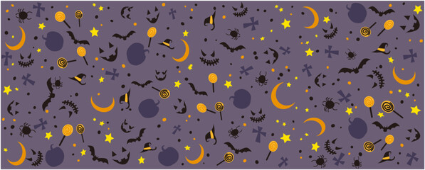 Happy Halloween concept repeated pattern. Halloween decorative elements wallpaper. Pumpkin, face, monster, bat, spider and candies design graphic. Vector illustration.