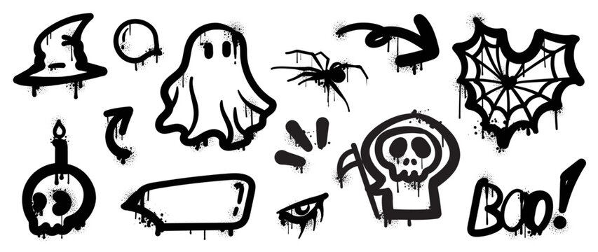 Set of graffiti spray pattern. Collection of halloween symbols, speech bubble, arrow, ghost, spider web, skull with spray texture. Elements on white background for, decoration, street art, halloween.