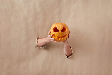 Halloween pumpkin held by female hands.