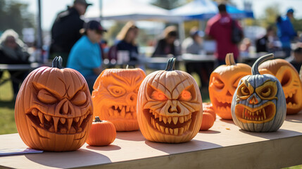 Pumpkin carving contest at a community event, showcasing creative designs. Generative Ai.