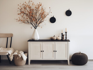 an elegant living room in neutral colors with pumpkin autumn decor