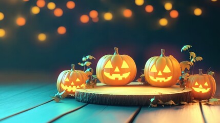 Cheerful Halloween Podium, vibrant 3D display, festive decorations, glowing elements, ideal for showcasing messages or announcements, perfect for Halloween events or festivities