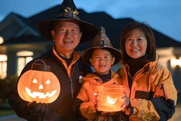 A family in Halloween costumes holding glowing pumpkins outside a house.