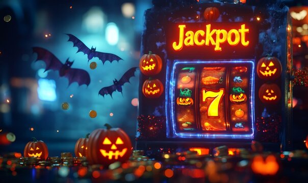 Slot machine displaying jackpot with halloween pumpkins and bats flying around, suggesting gambling during spooky season
