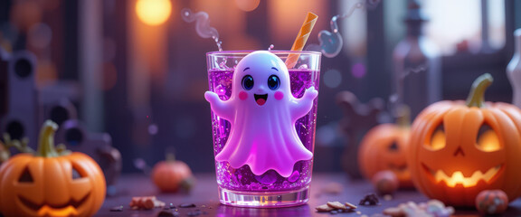 Spooky halloween drink with ghost decoration pumpkin display beverage photography festive atmosphere close-up view creative concept