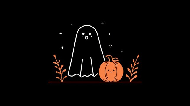 Charming and Spooky Halloween Celebration Scene Featuring Adorable Ghosts, Carved Jack-o'-Lanterns, and Colorful Candy, Ideal for Festive Autumn Designs and Holiday Invitations
