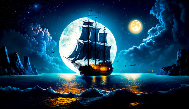 Ship floating in the ocean at night with full moon in the background. Generative AI.