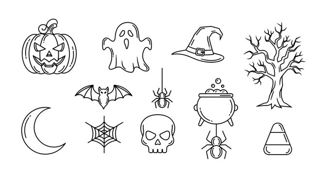 Collection of halloween themed line art illustrations in black and white
