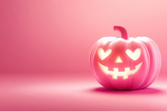 pink halloween pumpkin with heart eyes glowing on a pastel pink background