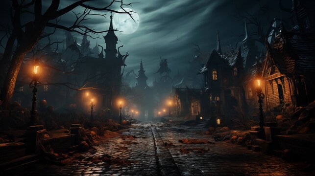 A spooky cemetery scene under a full moon, with glowing jack-o'-lanterns, bats flying, and eerie mist.