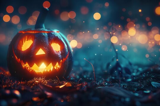 Glowing Halloween pumpkin scene with dark background, detailed textures and smoke effects, ample copy space