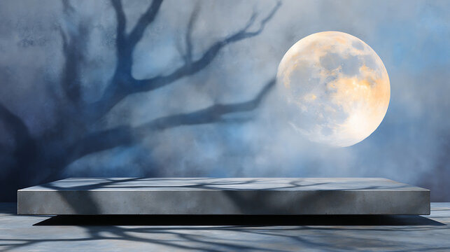 3D podium under full moon glow with eerie shadows and space for text, ideal for Halloween sales banners, spooky promotions, and seasonal article designs.