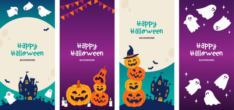 Halloween design banner set, full moon and pumpkin, turquoise and purple background