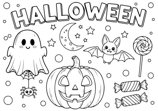 Halloween-themed coloring page featuring a smiling ghost, pumpkin, bat, spider, moon, stars, and candy