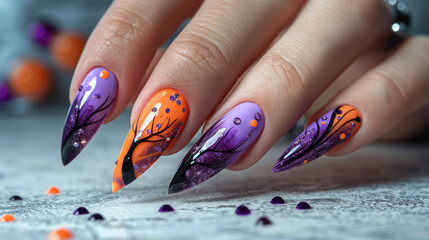 halloween themed nail art with purple and orange designs and sparkling details