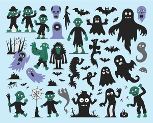 A halloween themed illustration featuring zombies ghosts bats and other spooky elements on a light blue background