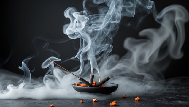 Smoke from incense on a black background creating an abstract texture, perfect for Halloween themes and aromatherapy concepts.