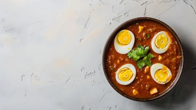 Indian egg masala curry served ceramic bowl white surface top down angle Spicy gravy halved boiled eggs popular North Indian dish India