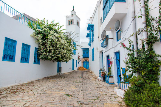 Hammamet Medina streets with blue walls. Tunis, north Africa.