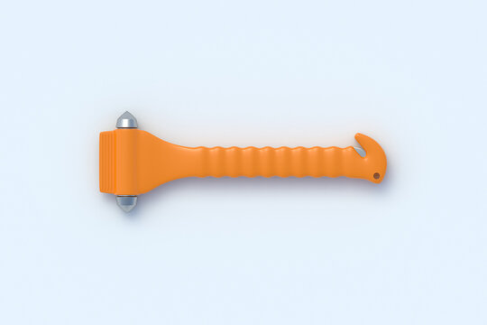 New safety hammer on gray background. Emergency tool. Rescue equipment. Breaker for car, bus or other vehicle window. Top view. 3d render