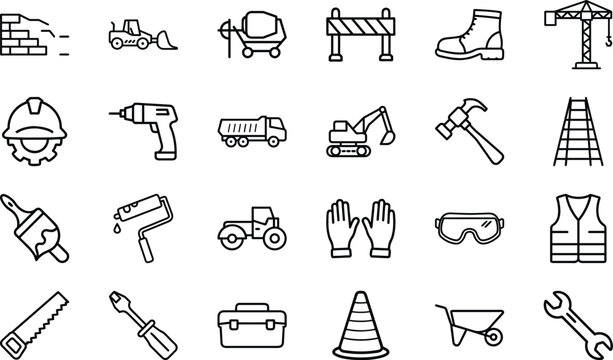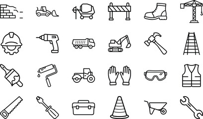 Set of 20 Outline Construction on White Background tools equipment safety