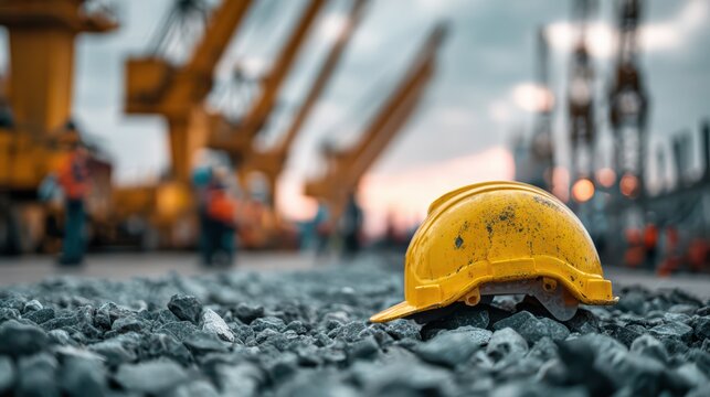 Hard hat on ground with blurred construction cranes in background, safety awareness concept, photorealistic