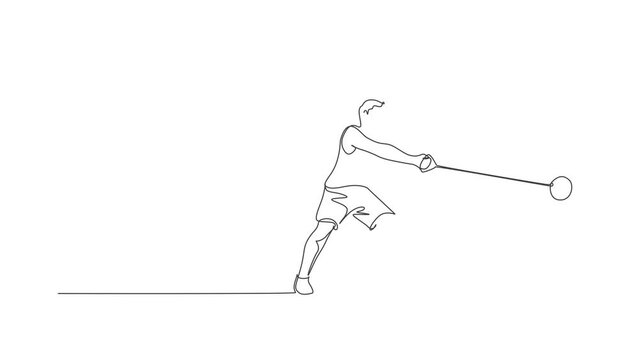 Animated self drawing of single continuous line draw young sportive man practice to swing hammer before throwing to the court stadium. Athletic games sport concept. Full length one line animation.