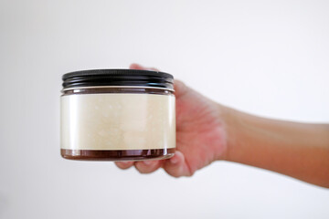 Close up of a right man's hand holding a plastic container of cookies