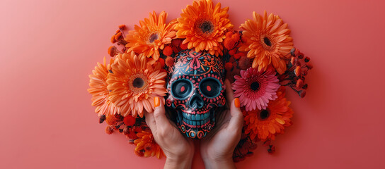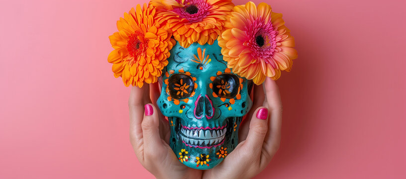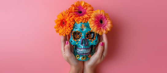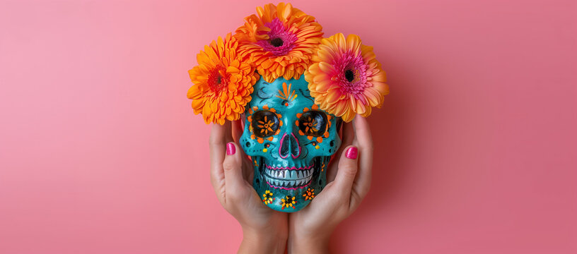 Hands holding a colorful Mexican skull adorned with orange flowers against a pink background with space for text. Banner, web, or advertisement about Día de Muertos and Mexican culture and tradition.