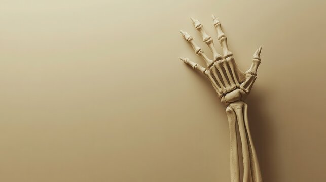 Skeleton hand reaching upward, minimalist backdrop, perfect for Halloween-themed designs, ample space for custom text, creates a striking visual impact.