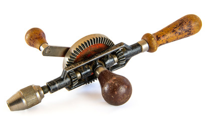 carpenter drilling a wooden plank with an ancient mechanical hand drill in atelier, closeup.