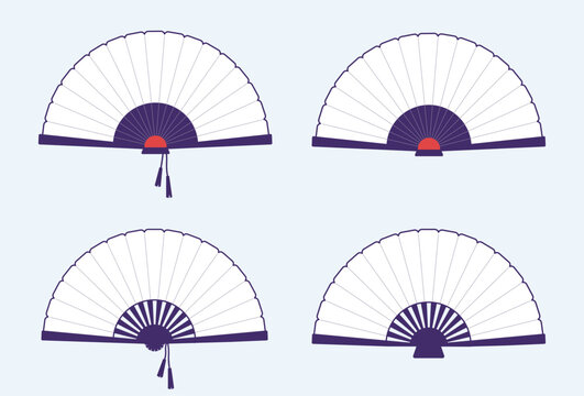 Paper fan. Chinese folding painted hand accessories. Japanese traditional vintage clothing decorative elements collection. Isolated Asian bright souvenirs. Vector oriental clothes set