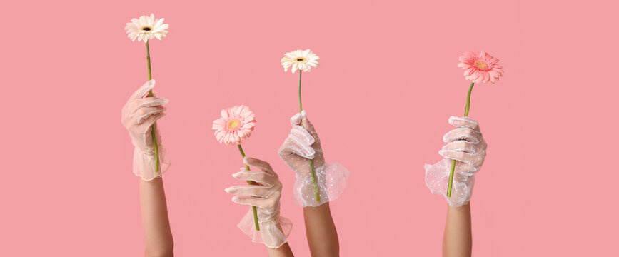 Female hands in laced gloves holding beautiful gerbera flowers on pink background