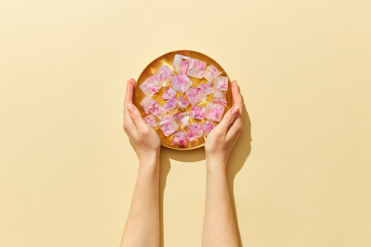 Female hands holding beautiful small gift wrapped with satin ribbon.