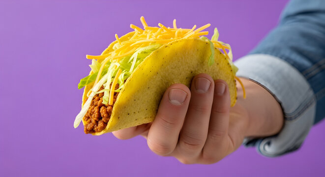 A man’s hand holding a taco filled with beef, lettuce, and cheese against a purple background.