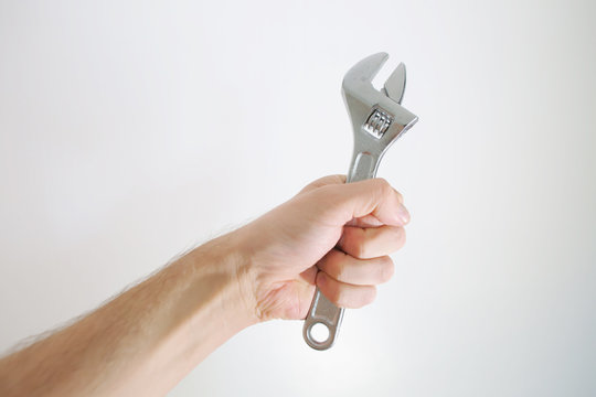 A man's hand holds an adjustable wrench on a black background. Place to place text.