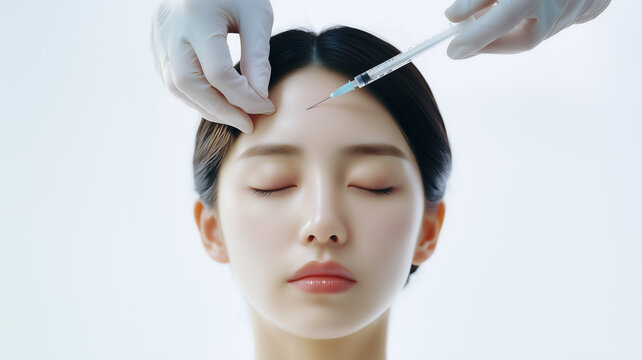 Asian cosmetic professional administering injections to women's forehead lines. Non-surgical facial for anti-aging treatments.