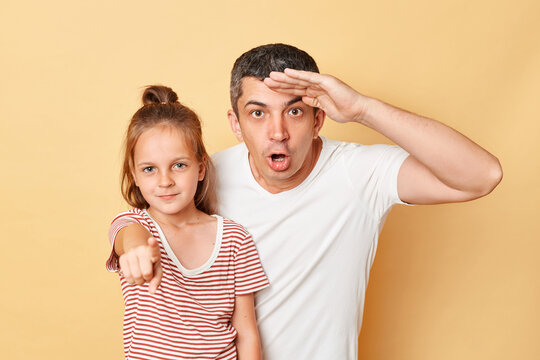 Studio portrait of handsome positive male keeping his hand over his eyes to protect from the sunrays. Bearded man looking at the camera keep his hand on forehead on studio wall background. People