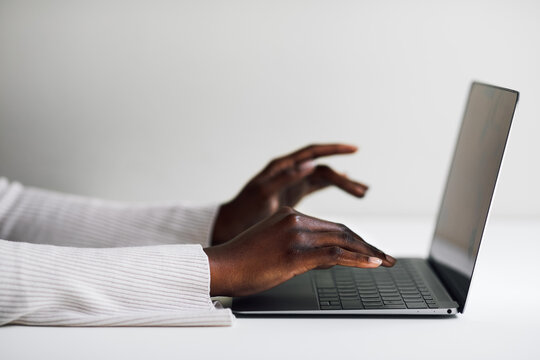 Close-up portrait typing keyboard on laptop computer. Working online on white table at office. Facebook chat. Website meeting. Blogger. Journalist writing articles. online job ideas