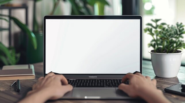 A close-up of a male hand holding a laptop with a blank screen, showcasing modern workspace technology.