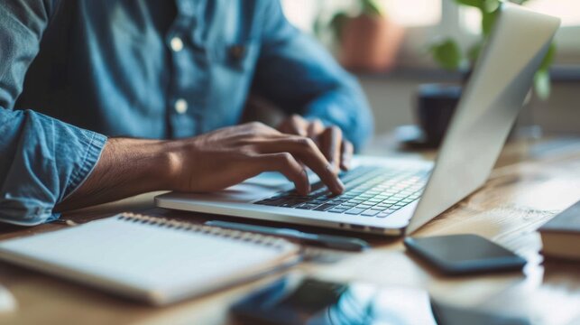 Camera slides around freelancer's hands typing on laptop keyboard in cafe. Businessman working at office with internet. Man searches new job on internet at coffeeshop. Business concept.