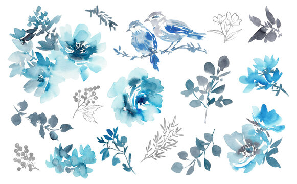 watercolor floral clipart set with abstract hand painted blue rose, eucalyptus leaves, birds, wild flowers and silver line art. Modern floral PNG illustrations for post card and stationary.