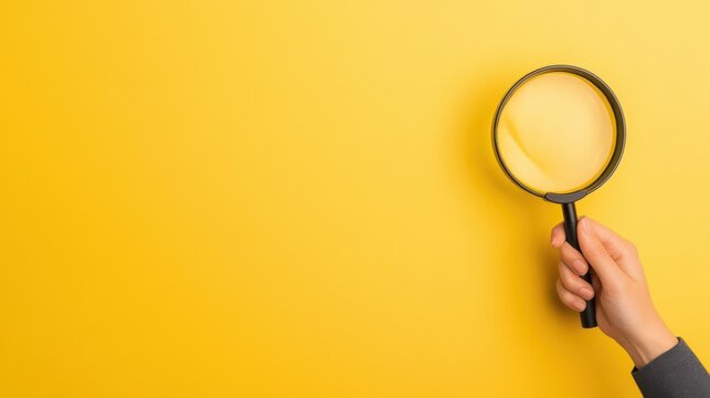 A hand holds a magnifying glass against a vibrant yellow background, symbolizing investigation, curiosity, and attention to detail.