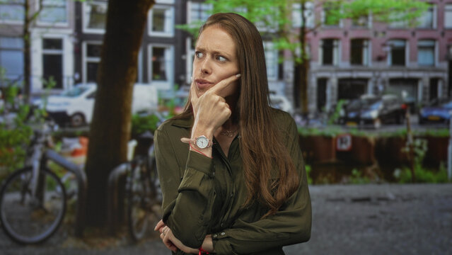 Woman hand on chin pensive pose on city street by canal with bicycles and buildings in daylight; curiosity pondering.