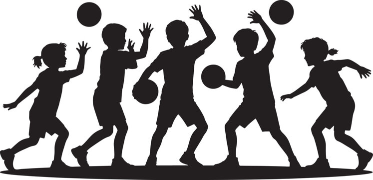 Silhouette Vector Illustration of Children Playing Handball with Balls on Transparent Backdrop