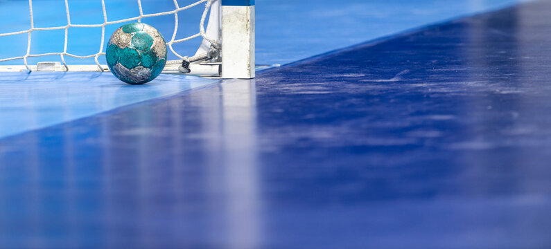 Gate and ball for futsal or handball in gym. Detail of gate frame and net. Outdoor football or handball playground. Horizontal sport poster, greeting cards, headers, website