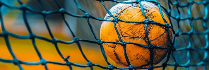 Gate for futsal or handball in gym. Detail of gate frame and net. Outdoor football or handball playground