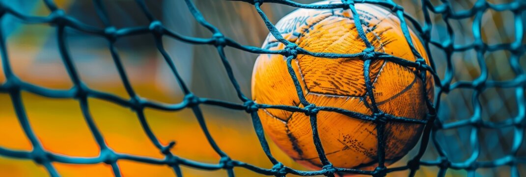 Shot of handball goal net with blurred bokeh lights in the background, illuminated in vibrant blue and red hue. Sports betting banner